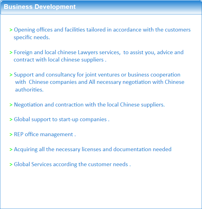Support and consultancy for business cooperation with Chinese companies. we will assist you during the negotiations with the Chinese companies.